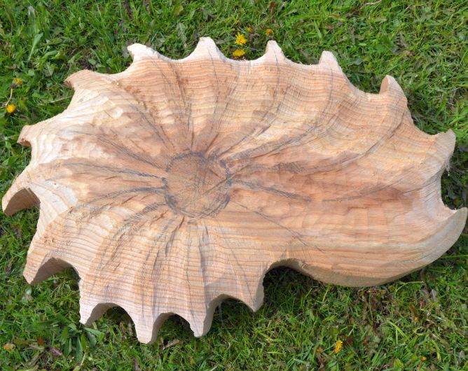 Bei meinen Vollholztrommeln "schnitze" ich die Form zur Gänze mit einer Motorsäge.Die äußere Oberfläche wird dann noch fein geschliffen und die hautseitige Kante nach Bedarf bearbeitet. Ich verwende nur einheimische Hölzer und keine Konservierungsstoffe!